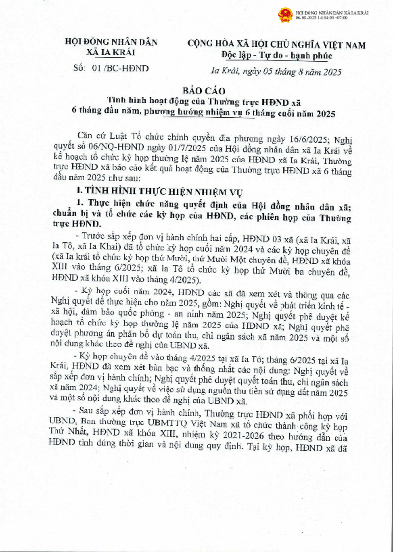 Tiêu đề văn bản | Báo cáo của Thường trực HĐND xã về tình hình công tác 6 tháng đầu năm và phương hướng, nhiệm vụ công tác 6 tháng cuối năm 2025 | ||