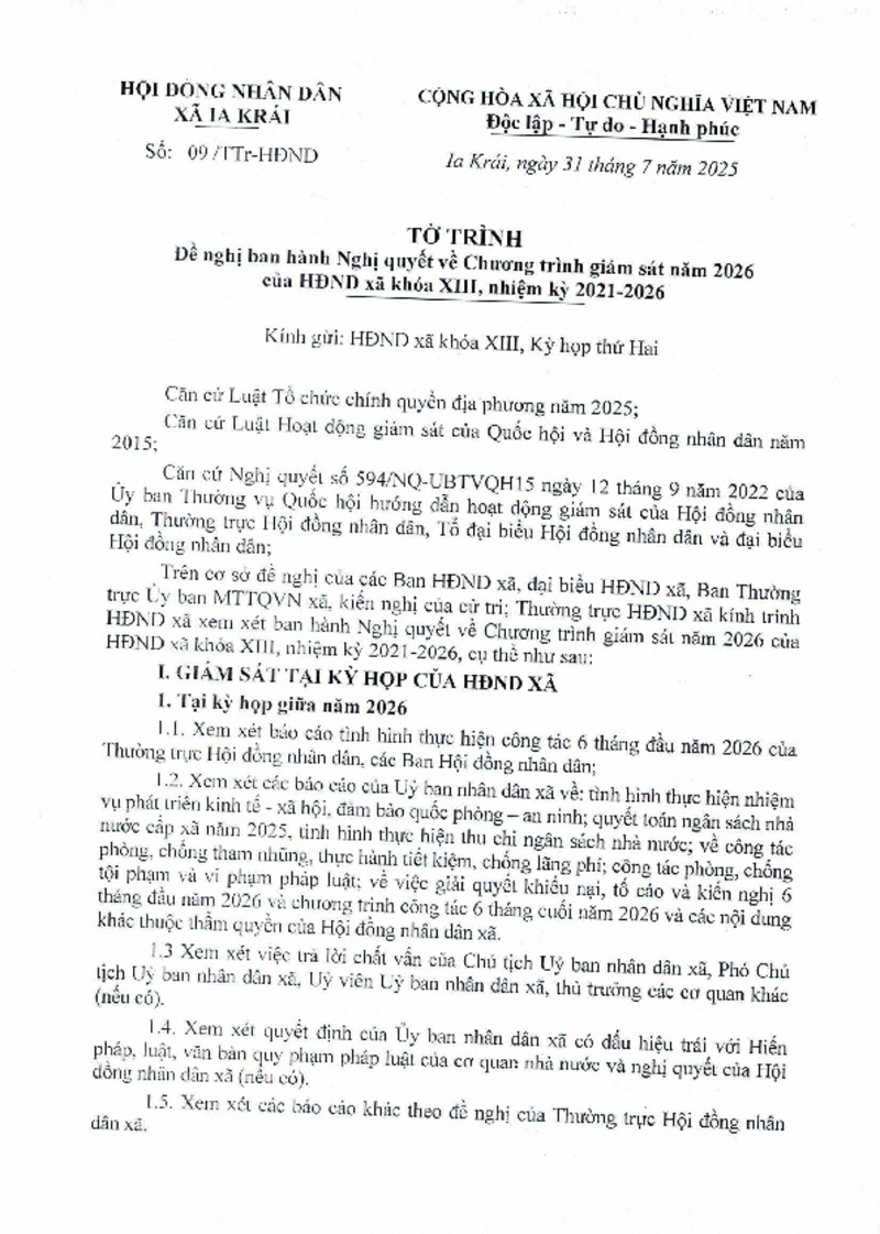 Tiêu đề văn bản | Tờ trình đề nghị ban hành Nghị quyết về Chương trình giám sát năm 2026 của HĐND xã khóa XIII, nhiệm kỳ 2021-2026 | ||