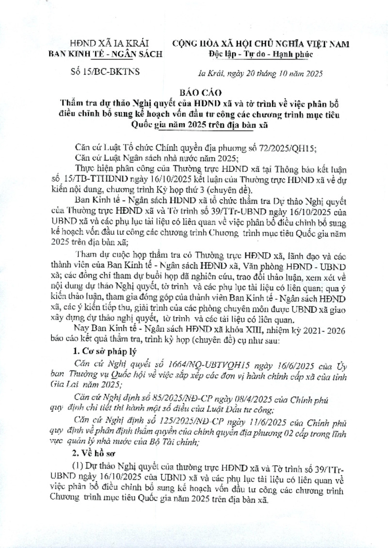 | Tiêu đề văn bản | BÁO CÁO Thẩm tra dự thảo Nghị quyết của HĐND xã và tờ trình về việc phân bổ điều chỉnh bổ sung kế hoạch vốn đầu tư công các chương trình mục tiêu Quốc gia năm 2025 trên địa bàn xã | ||