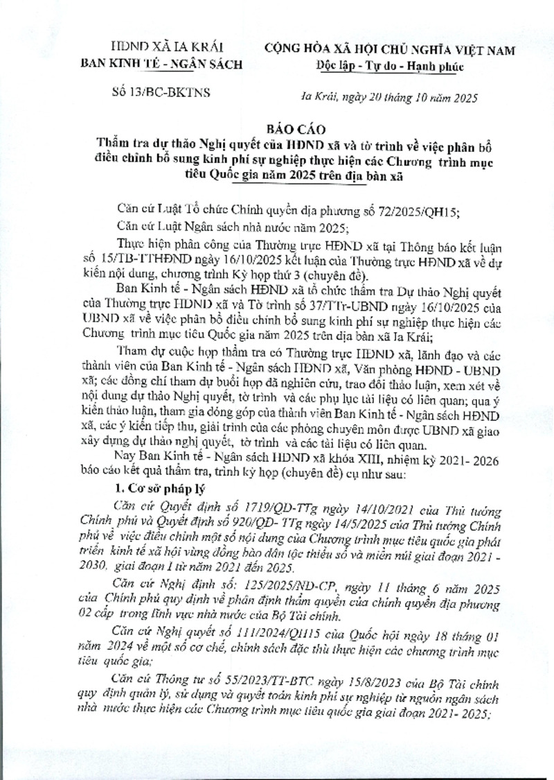 | Tiêu đề văn bản | BÁO CÁO Thẩm tra dự thảo Nghị quyết của HĐND xã và tờ trình về việc phân bổ điều chỉnh bổ sung kinh phí sự nghiệp thực hiện các Chương trình mục tiêu Quốc gia năm 2025 trên địa bàn xã | ||
