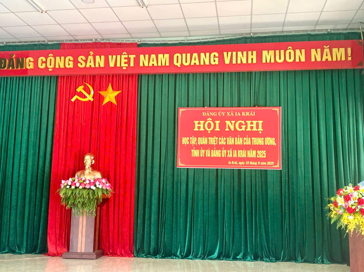 Sáng ngày 10/9/2025, tại Hội trường Đảng ủy - HĐND - UBND xã, Đảng ủy xã Ia Krái tổ chức Hội nghị học tập, quán triệt các văn bản của Trung ương, Tỉnh ủy và của Đảng ủy xã ban hành trong năm 2025. Hội nghị được tổ chức nhằm triển khai kịp thời, đầy đủ các chủ trương, đường lối của Đảng và chính sách, pháp luật của Nhà nước đến đội ngũ cán bộ, đảng viên chủ chốt trong toàn xã.