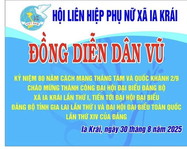 Hòa chung không khí tưng bừng của cả nước kỷ niệm các ngày lễ lớn, sáng ngày 30/8/2025, tại xã Ia Krái, hơn 400 hội viên phụ nữ đã cùng nhau tạo nên một màn đồng diễn dân vũ đầy màu sắc và sôi động. Sự kiện do Hội Liên hiệp Phụ nữ (LHPN) xã Ia Krái tổ chức nhằm chào mừng kỷ niệm 80 năm Cách mạng tháng Tám thành công (19/8/1945-19/8/2025) và Quốc khánh nước Cộng hoà xã hội chủ nghĩa Việt Nam (2/9/1945-2/9/2025), đồng thời chào mừng thành công Đại hội Đại biểu Đảng bộ xã Ia Krái lần thứ I, tiến tới Đại hội Đảng các cấp.