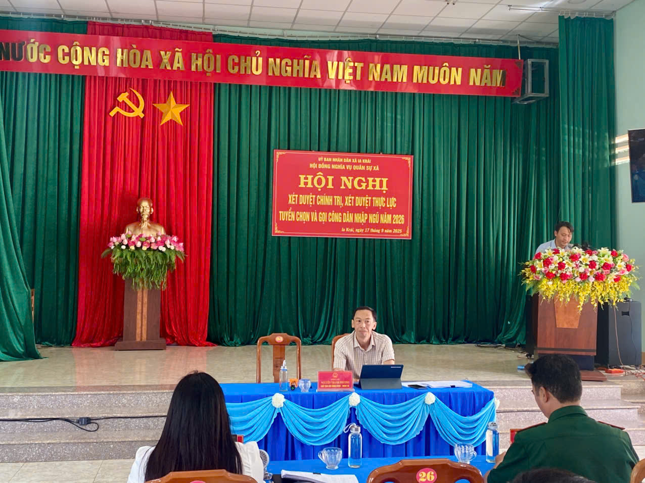 Chiều ngày 17/9/2025, tại Hội trường Đảng ủy - HĐND - UBND xã, Hội đồng Nghĩa vụ quân sự (NVQS) xã Ia Krái đã long trọng tổ chức Hội nghị xét duyệt chính trị, đạo đức và xét duyệt thực lực công dân sẵn sàng nhập ngũ năm 2026. Đây là một bước quan trọng trong quy trình tuyển chọn, gọi công dân nhập ngũ, nhằm đảm bảo công tác tuyển quân diễn ra công bằng, dân chủ, đúng luật và hoàn thành xuất sắc chỉ tiêu được giao.